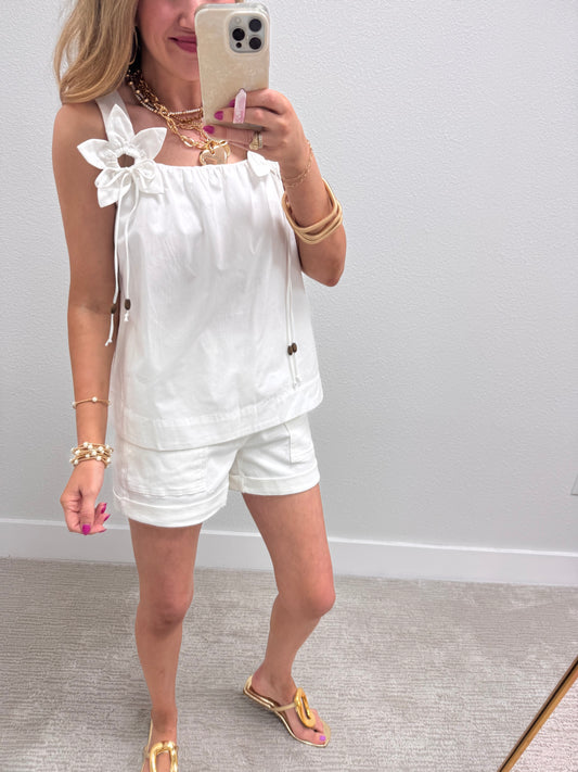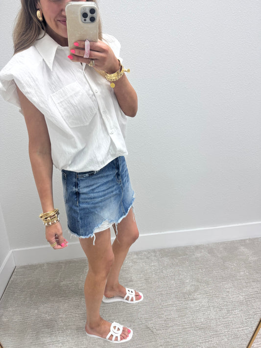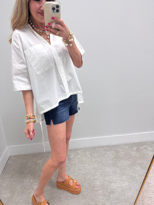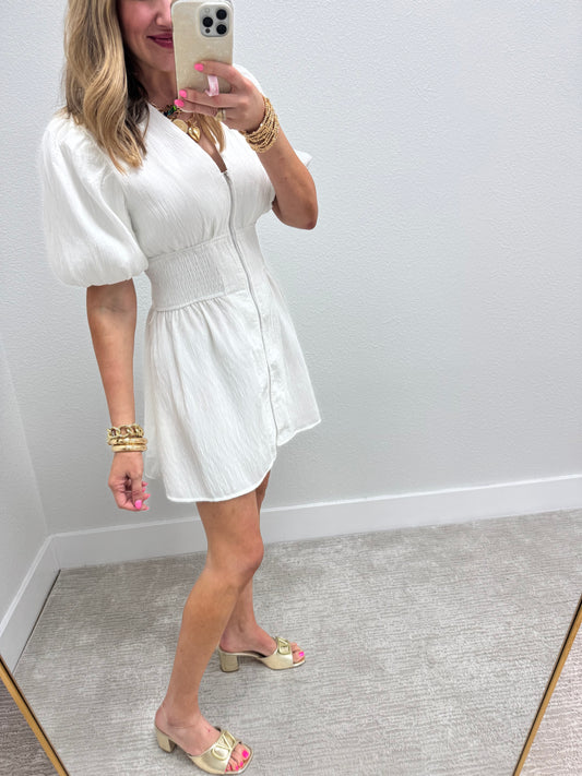 White V-Neck Puff Sleeve Front Zip Mini Dress