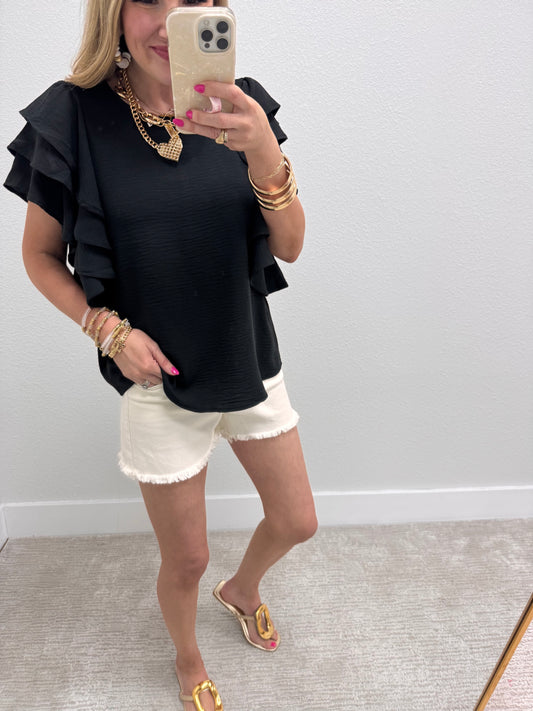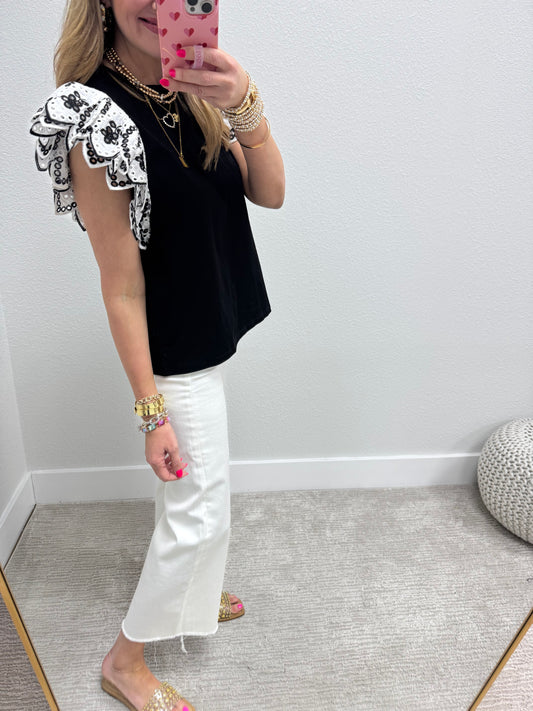 Black Top With Ivory Eyelet Ruffle Sleeves