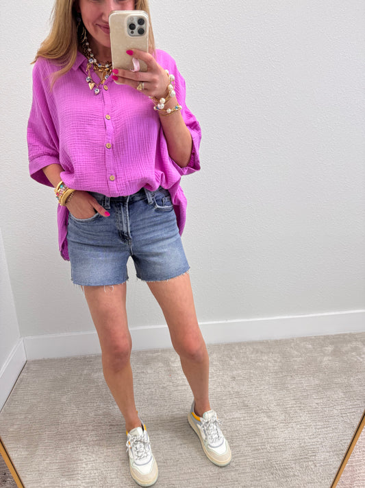 Bright Mauve Double Gauze 3/4 Sleeve Button Up Shirt