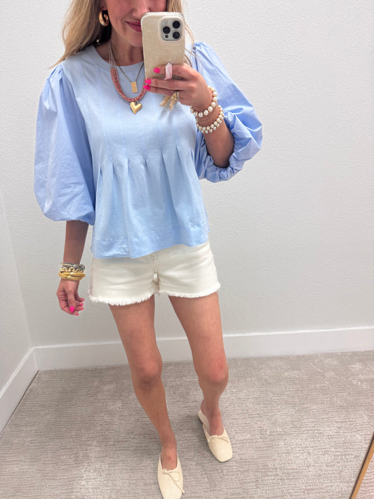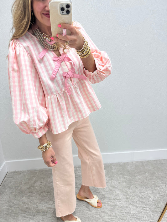 Baby Pink Gingham Tie Front Shirt with Bubble Sleeves