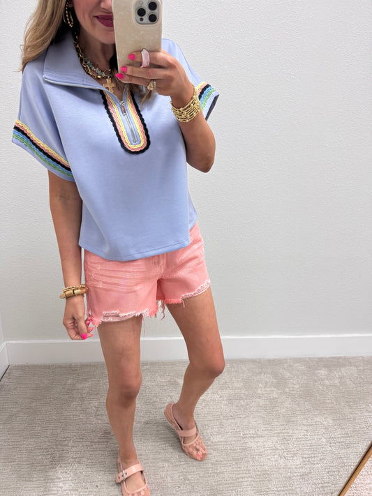 Ice Blue Half Zip Scuba Scalloped Trim Top