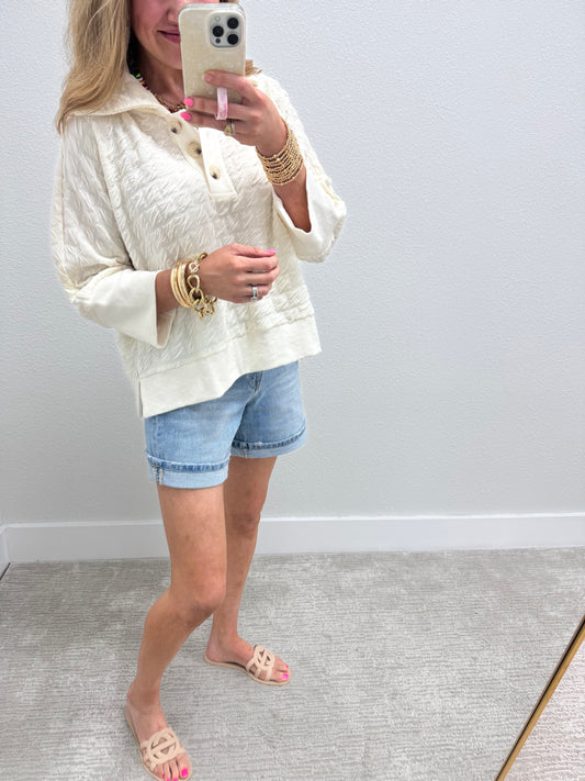 Ivory Quilted 3/4 Sleeve Top with Button Detail