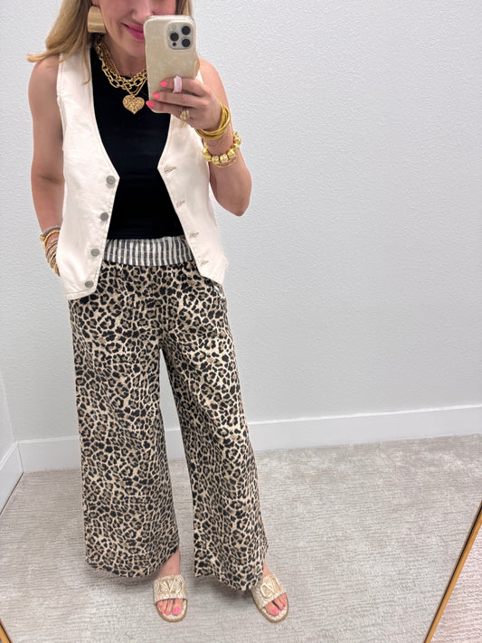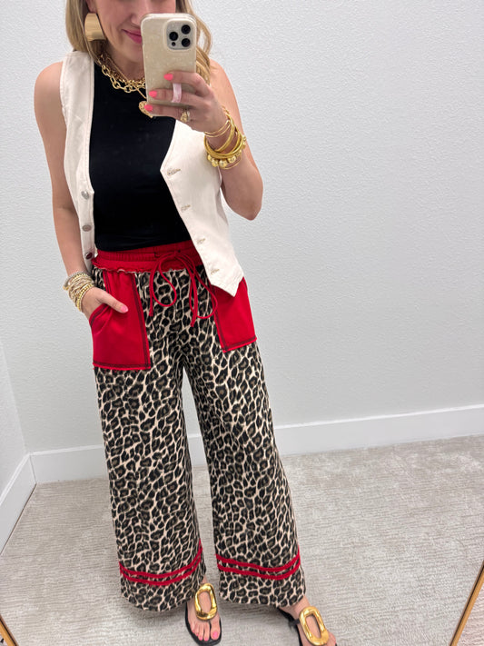 Red Detailed Leopard Print Terry Wide Leg Pant