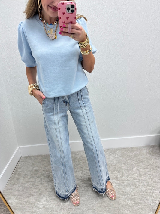 Mid Rise Light Wash Front & Back Seam Wide Leg Jean FS