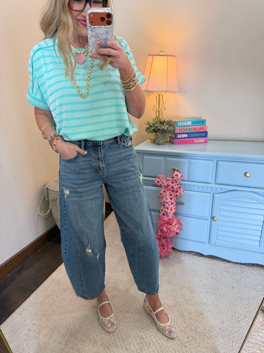 Turquoise Raised Rib Stripe Exposed Hem Top