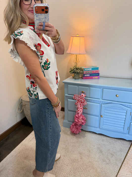 White Floral Print Flutter Sleeve Top