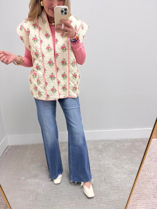 Ivory & Pink Floral Print Quilted Vest With Pockets