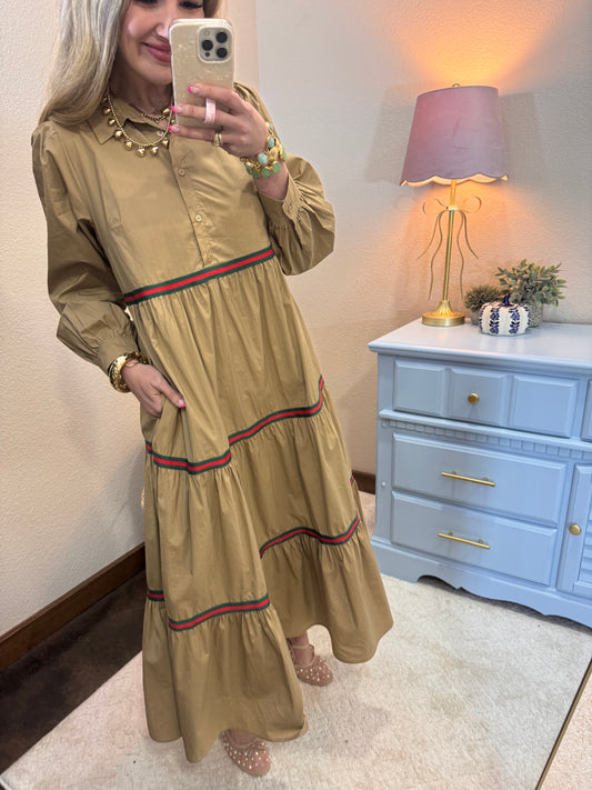 Taupe Stripe Trim Accent Tiered Midi Dress