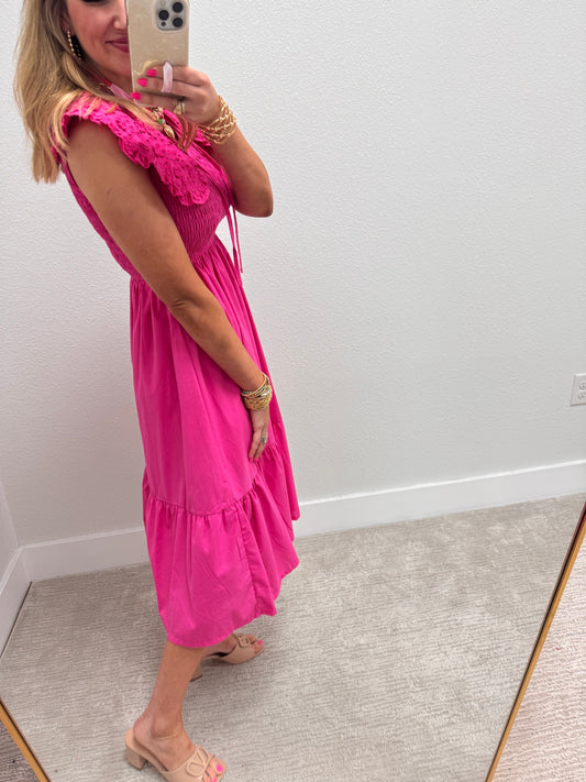 Hot Pink Peter Pan Collared Smocked Midi Dress