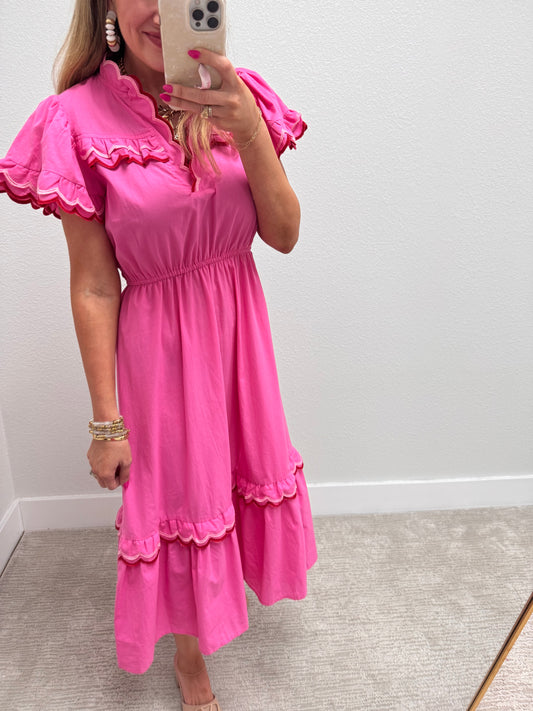 Pink Scalloped Trim Flutter Sleeve Midi Dress
