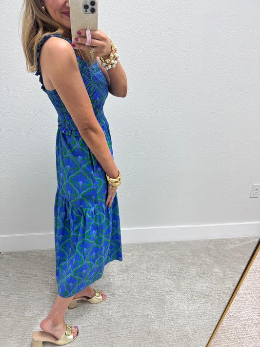 Royal Puff Sleeve Button Down Maxi Dress with Ruffle Neck