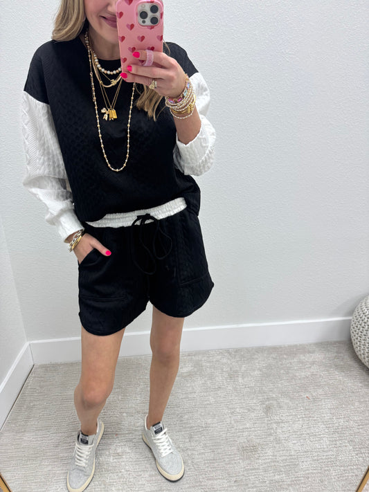 Black and White Quilted Two Piece Long Sleeve Short Set FS