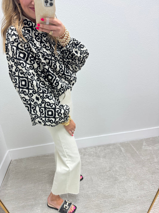 Black and Cream Oversized Button Down Shirt with Geometric Print
