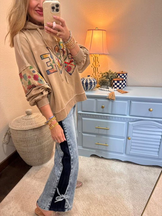 Mocha Love Patch Front Washed Terry Pullover Hoodie