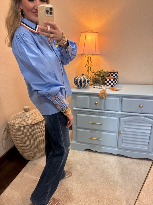 Navy Color Block Tiger Embroidered Shoulder Knit Top