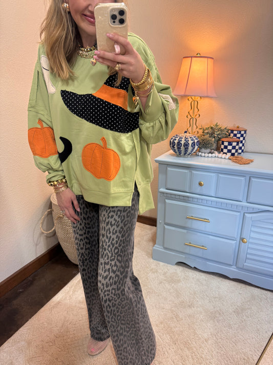 Light Olive Halloween Theme Patchwork French Terry Pullover
