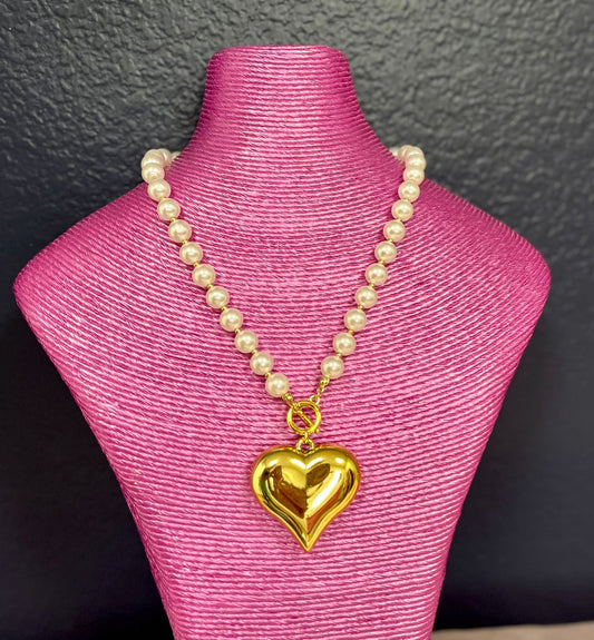 Large Pearl Bead Necklace with Gold Puff Heart