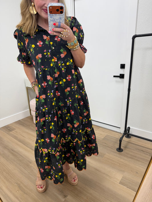 Black Floral Ruffle Collar Decorative Button Down Dress