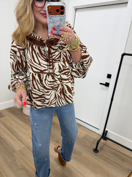 Mocha Zebra Tie Front Top