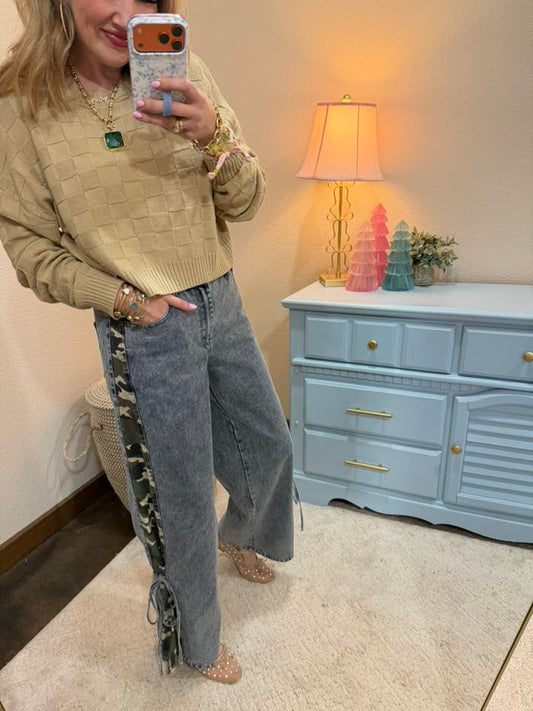 Camouflage Print Side Bow Tied Washed Denim Pants