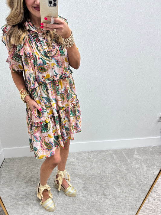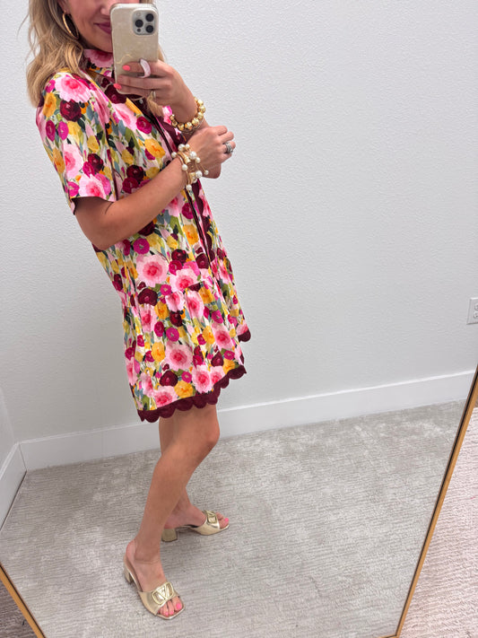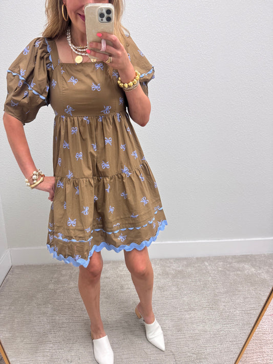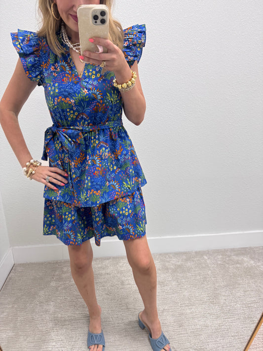 Blue Floral Tiered Mini Dress with Ruffle Sleeves