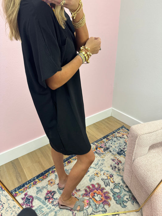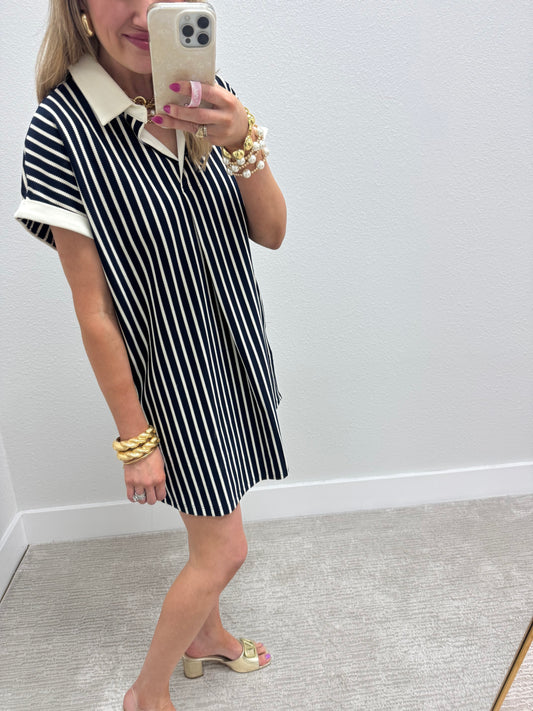 Ivory and Navy Striped Collared V Neck Mini Dress