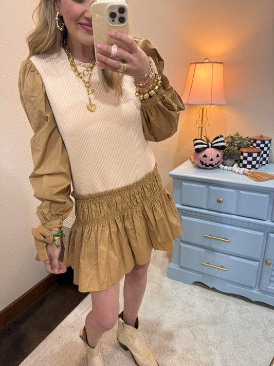 Camel Mixed Material Long Sleeve Dress