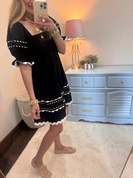 Black and White Ric Rac Puff Sleeve Dress