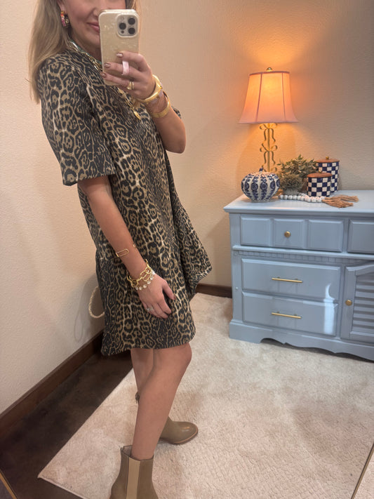 Leopard Print Denim Mini Dress With Pockets