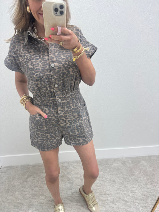 Leopard Short Sleeve Denim Button Down Romper with Pockets