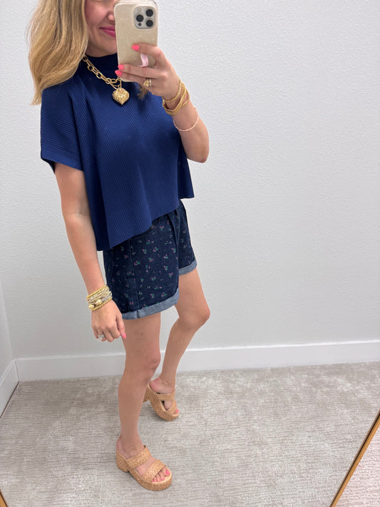 Navy High Neck Ribbed Swing Top