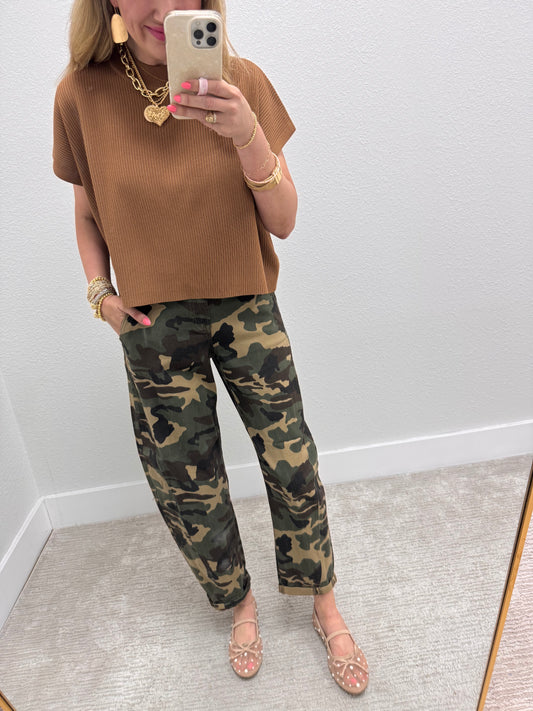 Deep Camel High Neck Ribbed Swing Top