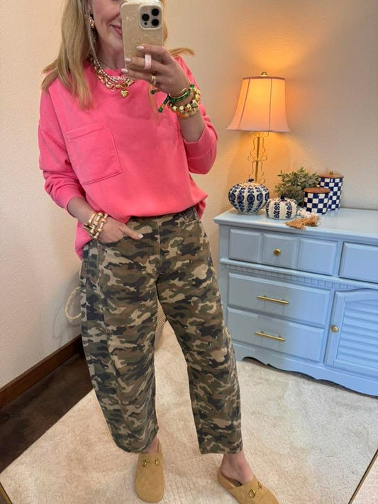 Pink Crew Neck Single Pocket Pullover Sweatshirt