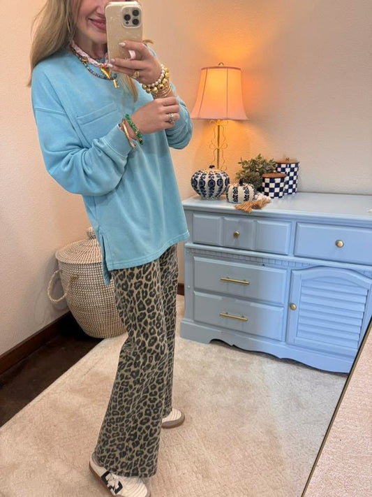 Sky Blue Crew Neck Single Pocket Pullover Sweatshirt