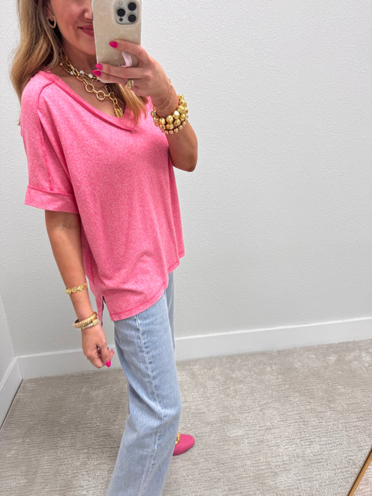 Pink Melange Hacci V-Neck Hi-Low Tee