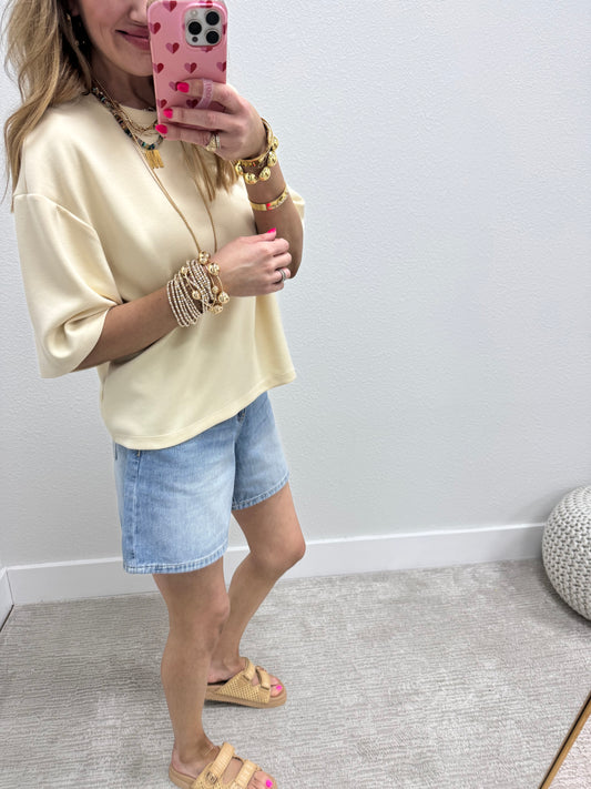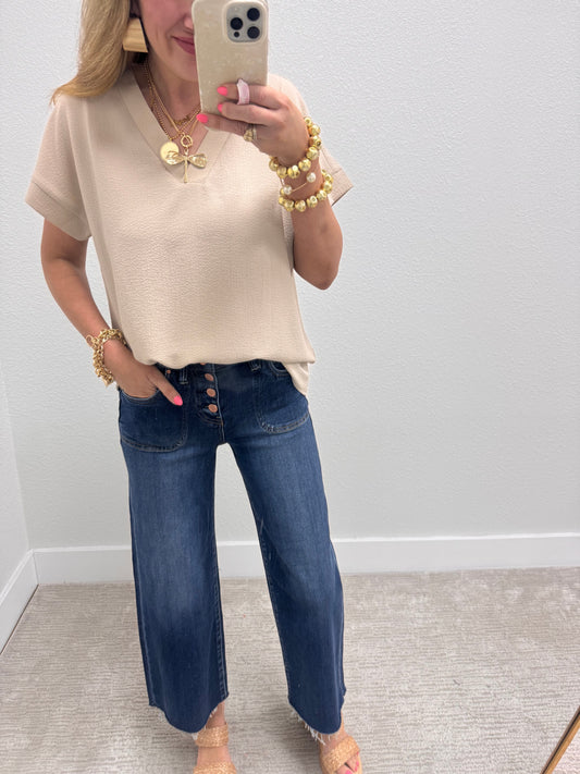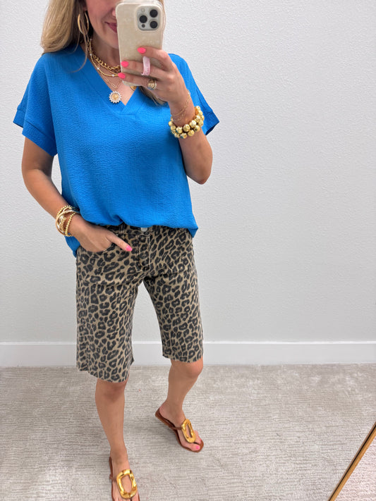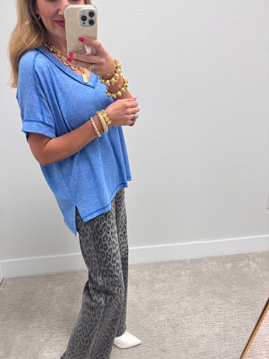 Ocean Blue Melange Hacci V-Neck Hi-Low Tee