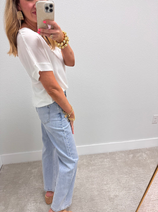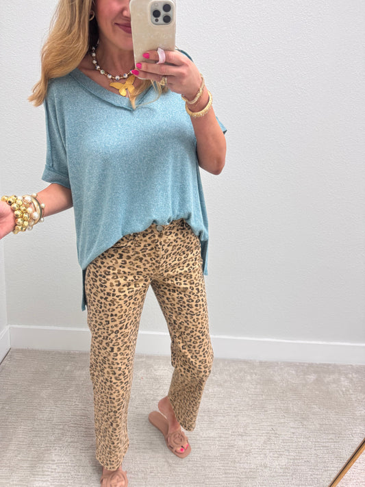 Dusty Teal Melange Hacci V-Neck Hi-Low Tee