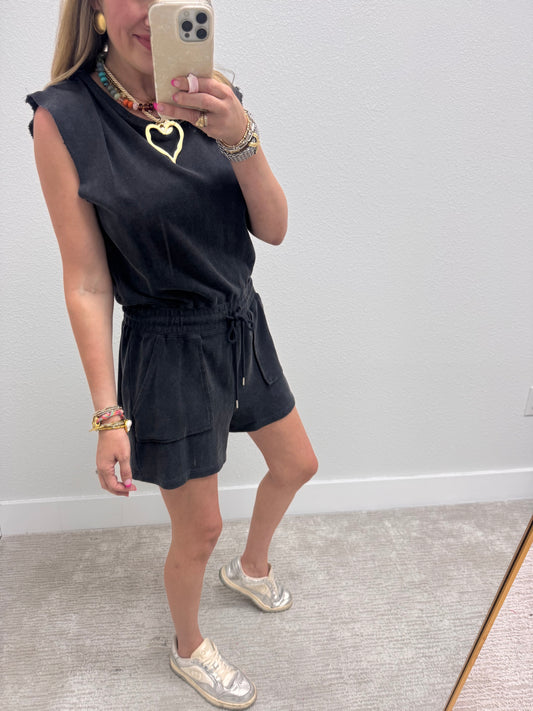Black Washed Drawstring Waist Romper