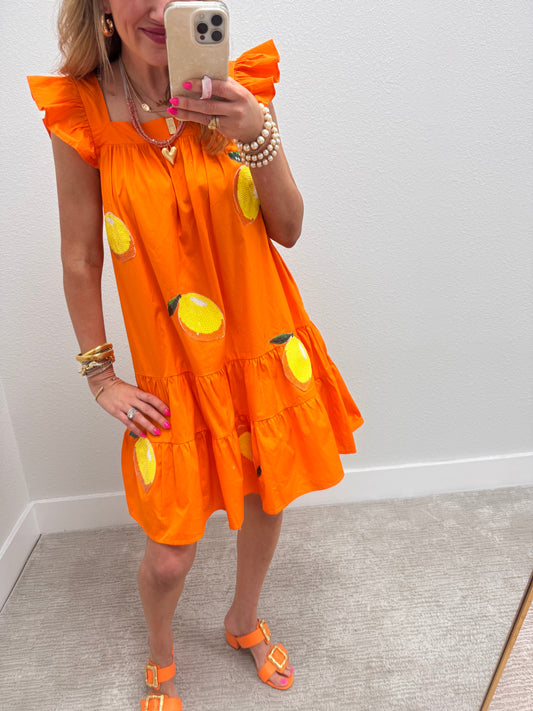 Orange Lemon Sequin Patch Dress with Ruffle Sleeves