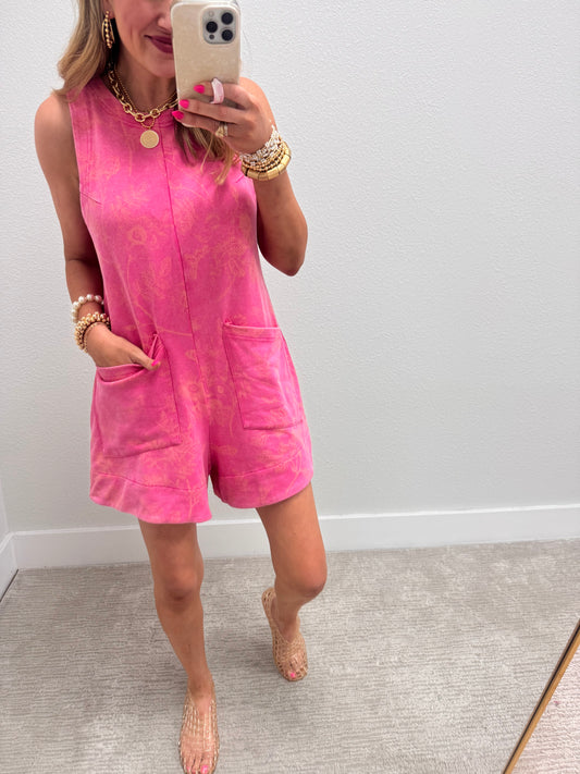 Pink Mineral Washed Floral Print Sleeveless Romper With Front Pockets