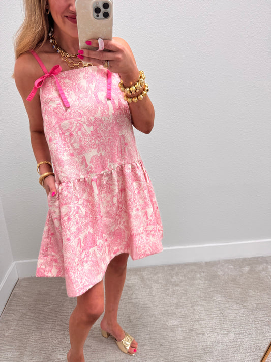 Pink Patterned Dress with Tie Sleeves