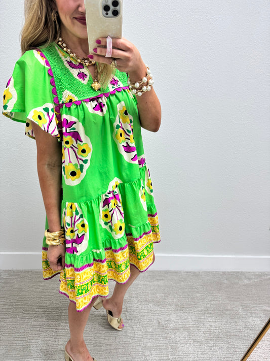 Bright Green Dress with Smocked Top & Trim Detail