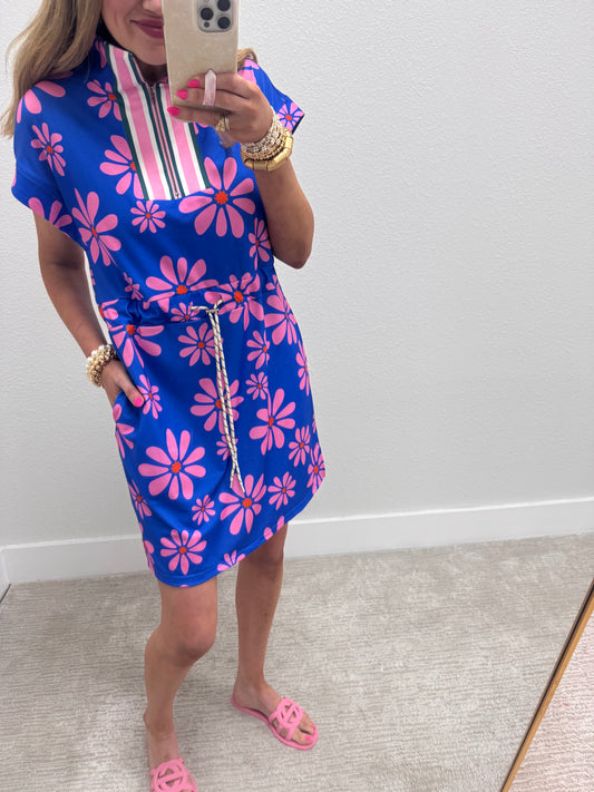 Blue and Pink Floral Drawstring Waist Dress