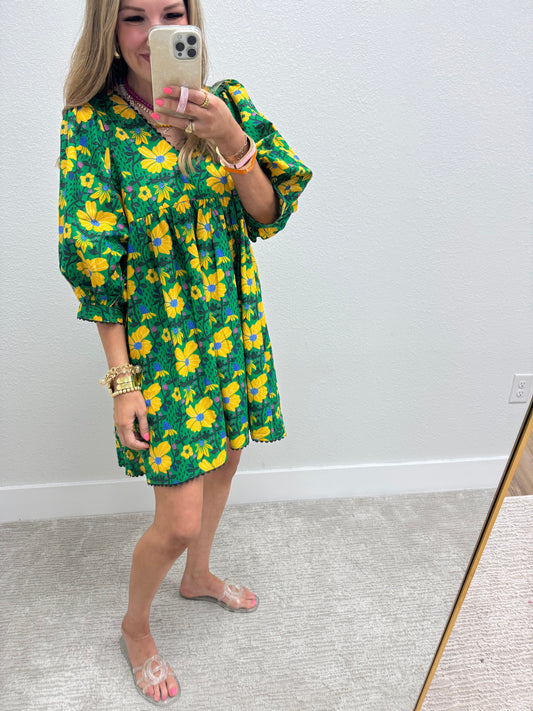 Floral Yellow And Green Print Puff Sleeve Dress