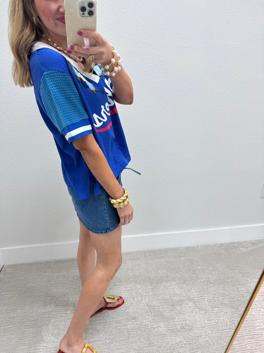 Blue Floral Detail with Lace Neckline Cheers Top
