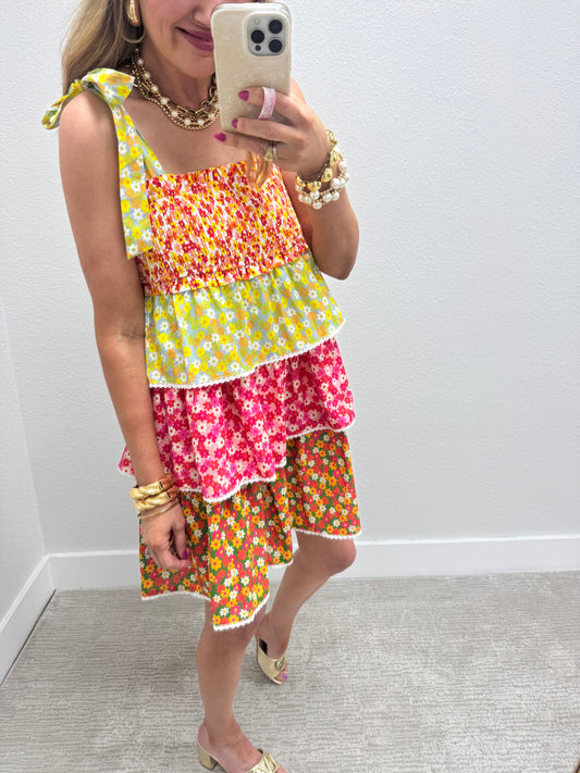 Floral Smocked Top Layered Mini Dress with Tie Sleeves