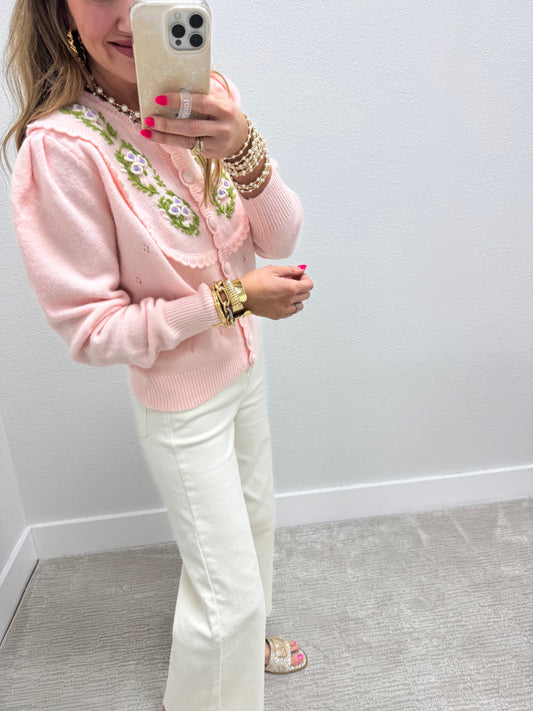 Light Pink Embroidered Sweater With Scalloped Edge