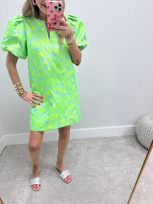 Green and Yellow Neon Floral Puff Sleeve Dress