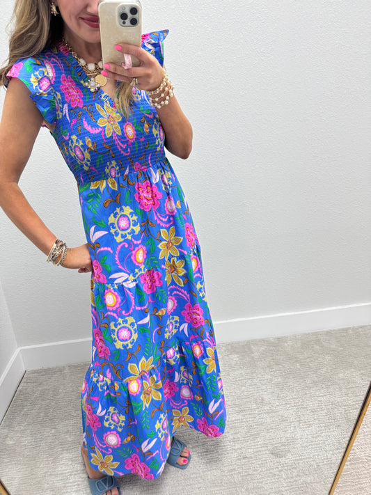Blue Printed Smocked Top Midi Dress