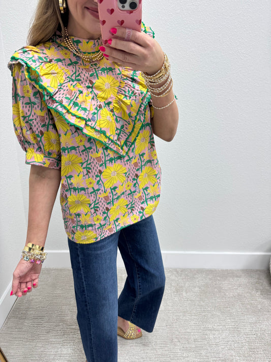 Red Vintage Print Top with Lace Trim Peter Pan Collar